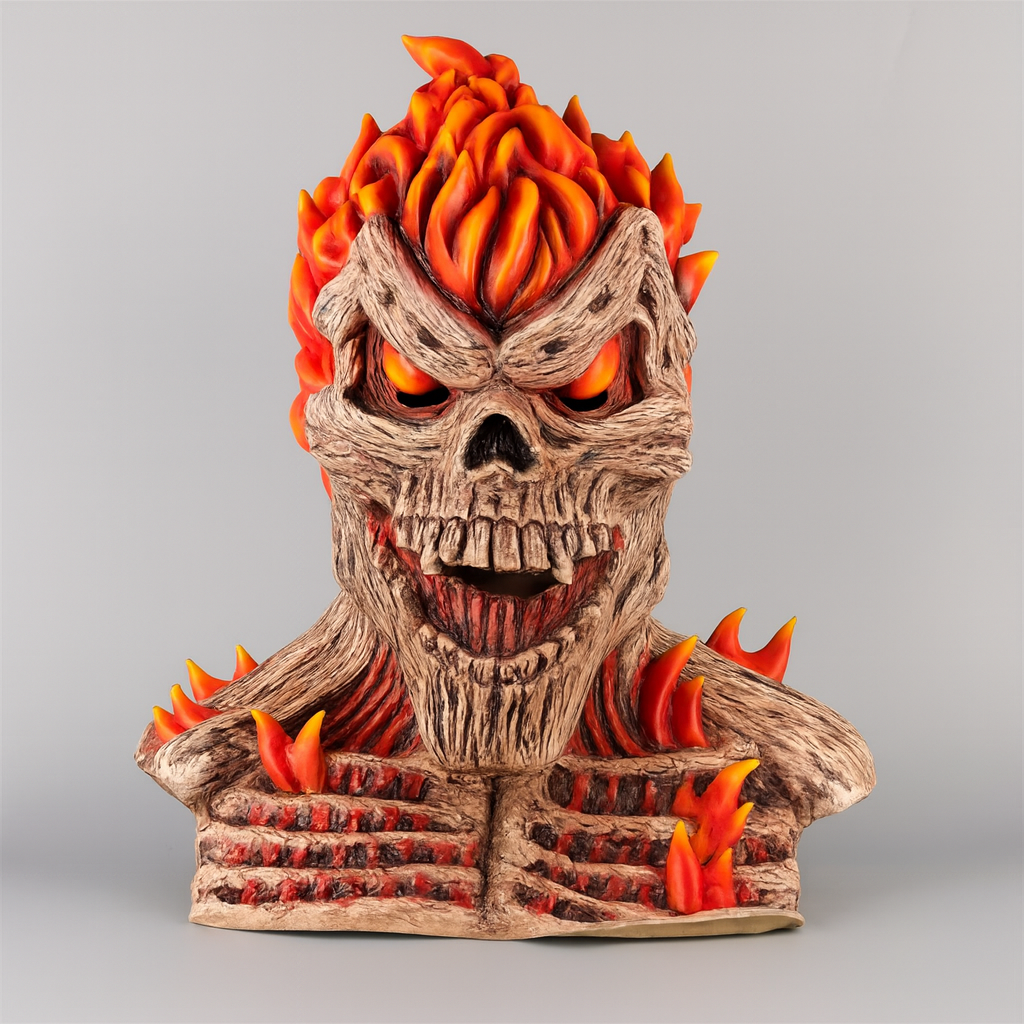 Masque de squelette fantôme en latex, style chevalier avec flammes. Costume unique pour Halloween.